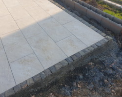 Große Terrasse aus Keramikplatten und Raseneinfassungen aus Altsteinpflaster